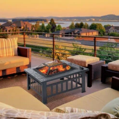 OUTSUNNY Brasero Cheminée Foyer Extérieur Carré Avec Tisonnier Métal Noir