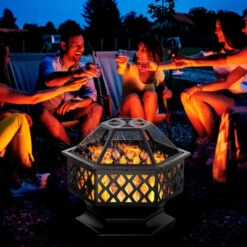 OUTSUNNY Brasero Hexagonal Pare-étincelles Avec Tisonnier Acier Noir