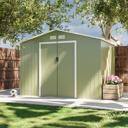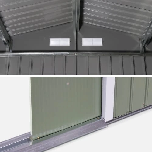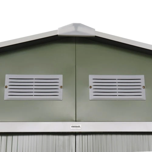 Cette maison de rangement est bien pensée. Elle est dotée d’une double porte coulissante pour ne pas perdre d’espace et faciliter le passage des outils. Les poignées peuvent, d’ailleurs, être liées par un cadenas (non fourni) pour sécuriser. Des grilles d’aération à l’avant et à l’arrière offrent une bonne ventilation et un peu de lumière dans l’abri. Le toit en pente, quant à lui, évite l’accumulation d’eau et de feuilles.