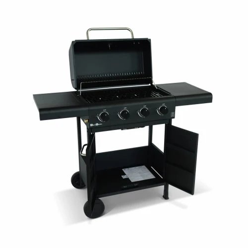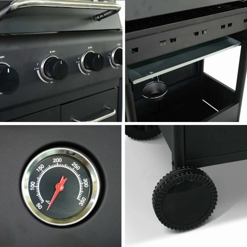 Ce barbecue noir en inox au design linĂ©aire est Ă©quipĂ© de 4 feux puissants, de deux grilles de cuisson en acier ainsi que d’une grille pour garder au chaud vos aliments. Un thermomètre est prĂ©sent pour vous permettre de surveiller la tempĂ©rature lors de la cuisson. Sa structure en acier est recouverte de peinture Ă©poxy, très durable et rĂ©sistante. Ses poignĂ©es et et brĂ»leurs sont en acier inoxydable et donc rĂ©sistants Ă la corrosion.