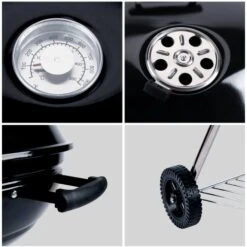 Le barbecue Georges est stable et se déplace facilement grâce aux grandes roues dont il est doté. Bien pensé, son capot est équipé d’un crochet à l’intérieur, pour l’accrocher à la cuve et ne pas le laisser par terre lorsque vous le soulevez pour vérifier la cuisson. Le barbecue comporte plusieurs grilles: une de cuisson, une pour le charbon, et une aux pieds pour poser vos accessoires. Un thermomètre