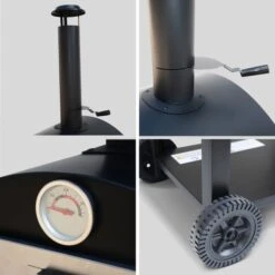 Pour surveiller la cuisson de votre pizza, un thermomètre est intégré au four à pizza. Les conduits d’aération permettent de réguler la chaleur et d’obtenir une cuisson parfaite. L’étagère inférieure est utile pour poser ses aliments, ses plats et ustensiles. L’ensemble est complet : il comprend une pierre de cuisson, une pelle, une housse de protection pour le protéger et une roulette pour découper vos pizzas tel un vrai pizzaiolo. La pierre de cuisson de 12mm d’épaisseur permet de cuisiner des pizzas de 30 cm de diamètre.Grâce à la pelle et son manche en bois de 50cm, vous pourrez sortir les aliments en toute sécurité.Ce barbecue se déplace facilement grâce à sa
