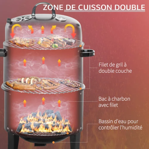 – Barbecue smoker pratique pensé pour une cuisson maîtrisée grâce à son thermomètre et à son aérateur