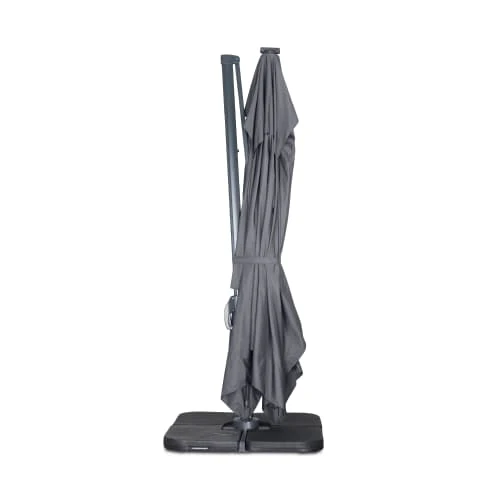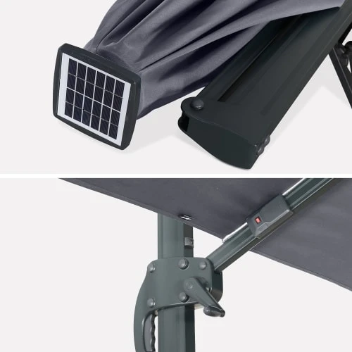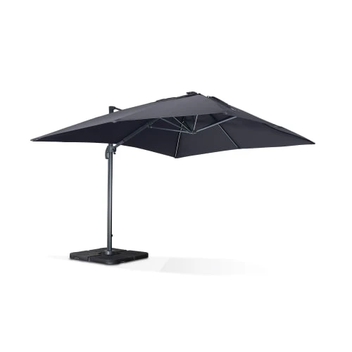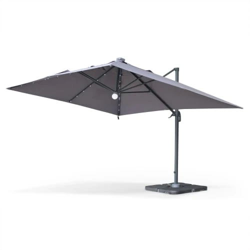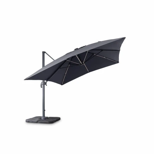 Temps de charge : 2 à 3 heures. Temps d’utilisation : 2 à 3 heures (fonctionne en étant branché sur secteur). Hauteur du parasol : 2m70 (2m au point le plus bas). Poids : 30 kg. Attention, les dalles nécessaires pour lester le parasol ne sont pas fournies, vous retrouverez une sélection de dalles dans notre boutique (remplissables ou en résine). Vous pourrez trouver également des lests spéciaux en béton (de 40x40cm à 50x50cm), dans les grandes surfaces de bricolage.