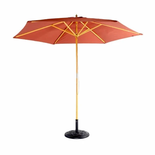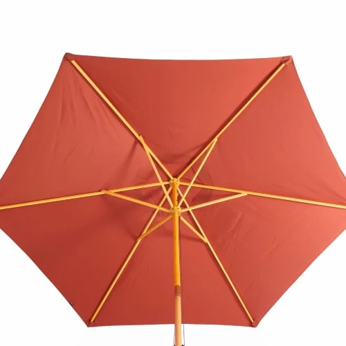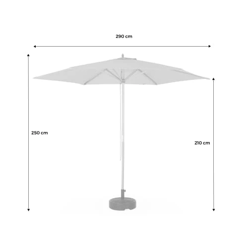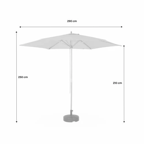 Parasol à mat centralToile 290 cm de diamètreTissu 100% polyester, UPF50+Aération au sommetSystème d’ouverture mécanique par corde et poulie6 baleines en boisMât en bois Ø38 mmHauteur du parasol: 250cm (220cm au point le plus bas)Poids: 4,8kg