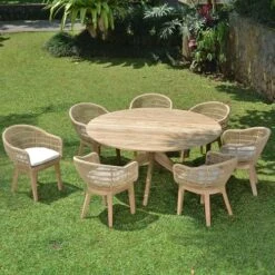 Pour un coin repas unique, optez pour la table de jardin Sakai qui fait rimer originalité et convivialité.Son remarquable et sculptural pied araignée supporte un plateau latté en teck massif. Avec son diamètre de 165 cm, la table Sakai pourra accueillir 8 convives.